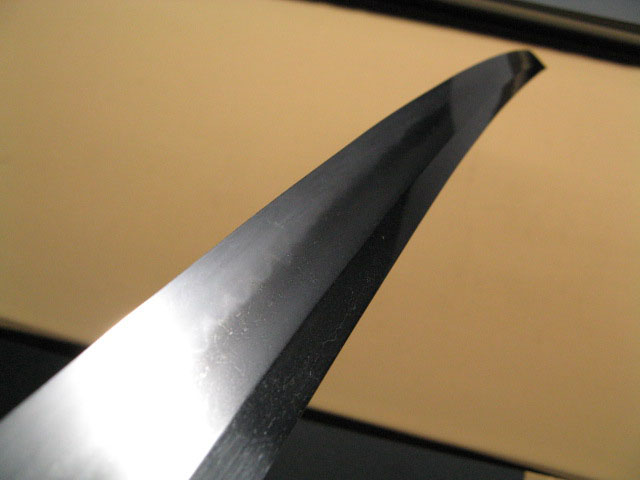 Настоящий меч - катана - форма клинка shinogi-zukuri, киссаки среднего размера chu-kissaki, с поверхностью клинка вида отполированной древесины ko-itame.